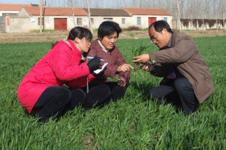 为降低小麦良种遭受冻害风险及纹枯病的发生,3月5日,安徽农垦龙亢农场组织农技人员深入田间地头现场指导科学田管。图为农场农业专家许化武(右一)在十分场职工邵志芬良种田地里查虫并指导.