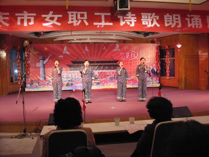 今年是农垦成立60周年,皖河农场工会抓住“三八节”这个节点,组织女职工开展朗诵会、歌咏会等系列活动,回顾农场的沧桑巨变,讴歌农垦创业精神,反映女职工的精神风貌。图为农场女工在安庆市总工会举办的朗诵比赛上表演自己创作的诗歌《农垦之歌》。