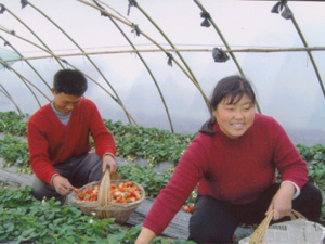 安徽省水家湖农场鼓励职工调整产业结构,大力发 展大棚草莓生产,目前已有十几位草莓种植户,为 水家湖农场经济增长、职工增收起到了重要作用。 图为大棚草莓种植户采摘草莓时喜悦的心情。