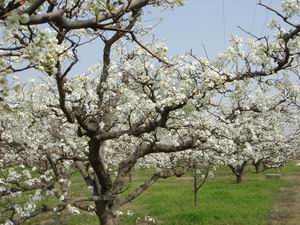 图片说明:"忽如一夜春风来,千树万树梨花开”。 砀山果园场万亩梨园竞相开放,千万棵梨树在黄河 故道的环绕下绽放着雪白的花朵,她舒展着双臂好 像迎接各界朋友的到来。