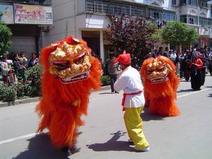 5月6日,龙亢农场夕阳红艺术团组织一支40多人组成 的表演队,参加安徽省怀远县第十四届花鼓灯艺术节 的踩街活动,受到沿街数万名观众的赞扬.图为艺术 团在表演狮子。(王戴群)