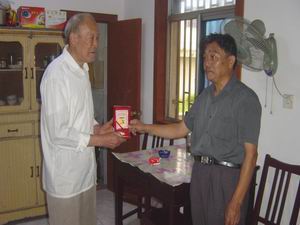 今年是中国人民抗日战争胜利60周年,为表达党中 央、省委、集团公司党委和农场党委对我场参加过 抗日老同志的亲切关怀和慰问。8月29日,大圹圩农 场党委书记李家华带领场党群办的同志,冒雨来到 天长市杨村镇和天长市静安小区,登门慰问我场参 加过抗日的离休老干部陈杰林和阮岚庭同志,给他 们送去由党中央、国务院、中央军委为他们颁发的 “抗战60周年纪念章”及农场给他们的慰问金。两 位年过八旬的老同志接过纪念章,激动之情溢于言 表,他们对上级党委及农场给他们的关心和问候深 表谢意。(杨朝幸)